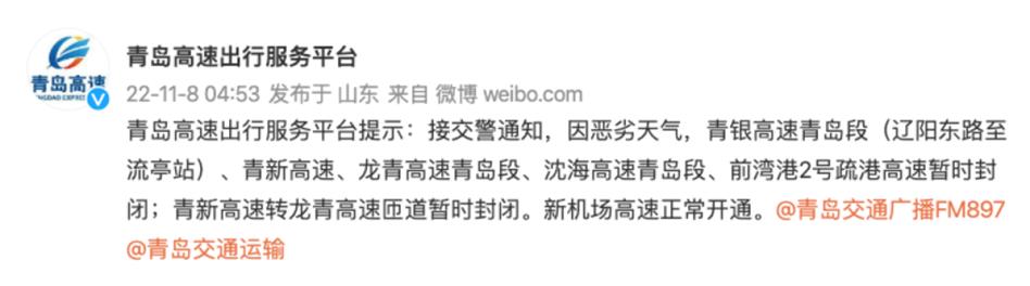 接交警通知,因惡劣天氣,青銀高速青島段(遼陽東路至流亭站)、青新高速、龍青高速青島段、沈海高速青島段、前灣港2號疏港高速暫時封閉;青新高速轉(zhuǎn)龍青高速匝道暫時封閉。新機場高速正常開通。