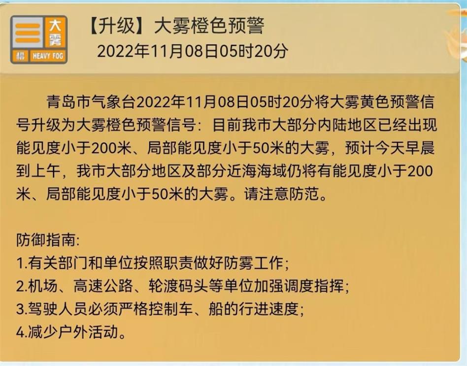 青島市氣象臺2022年11月08日05時20分將大霧黃色預(yù)警信號升級為大霧橙色預(yù)警信號:目前我市大部分內(nèi)陸地區(qū)已經(jīng)出現(xiàn)能見度小于200米、局部能見度小于50米的大霧,預(yù)計今天早晨到上午,我市大部分地區(qū)及部分近海海域仍將有能見度小于200米、局部能見度小于50米的大霧。請注意防范。
